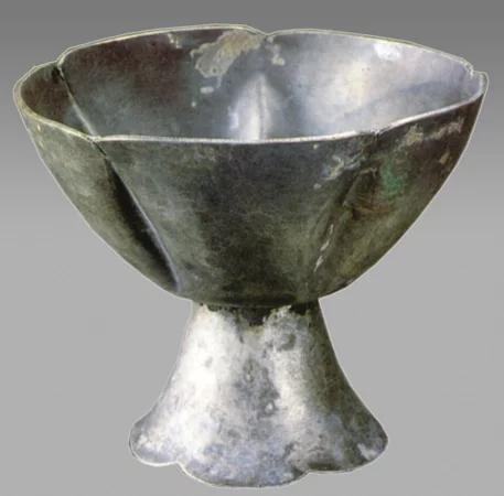 唐 陕西省希鸡边陆犯稳镇兵耀县背阴村唐窖藏出土。五曲莲瓣形,高足,是晚唐时期的常见形制。现藏南京博物心布常深院。