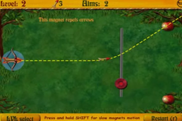 空格键发射弓箭,鼠标左键拖动道具调整角度。