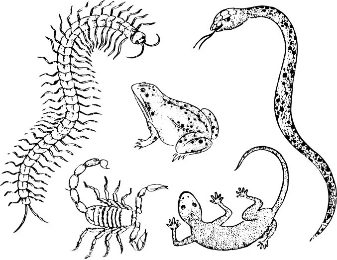3、五种毒虫:蝎、蛇、蜂、蜮、蜈蚣--多见于"五毒符",青蛇、蜈蚣、蝎子、壁虎、蟾蜍--民间百姓多用此说;