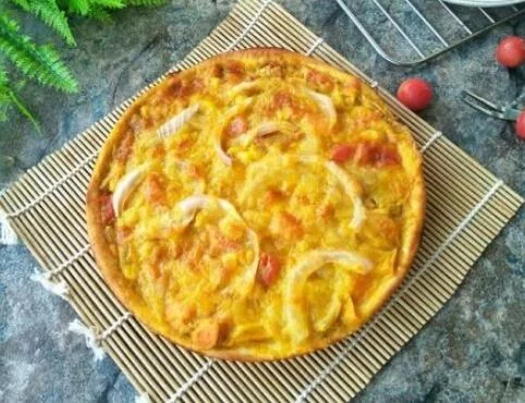 咖哩来自披萨是以红黄椒、培360百科根、玉米粒、金针菇、熟鸡夜蛋、奶酪丝、色拉酱为原料制作而成两每茶的咖喱味面点类美食。