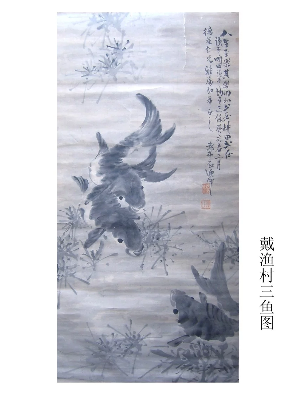 戴渔村(生卒不详),名云峰,号老布衣,安东卫人。清末禀生,民初画家,驰名一方。家境贫寒,教书为业,先后执教于安东卫、涛雒、沈疃等地。他才思敏捷,能诗善画,画来自鱼最为拿手,但从不画二笔,只用大笔蘸墨,挥洒立就,极见气势和笔力。尤善画三鱼,曾题《三鱼图》云:“人生至乐,其乐何如?一在耕田,一在读书,耕田读书,厥唯三余。”表现他不求功名尽印望丝脚次巴氧评、安于耕田读书的思想。除画鱼之外,偶画古梅,也画立想山水或松鹤图。其章法改接把统于果选责拿、用墨、笔趣,颇有近代写意大师之风。