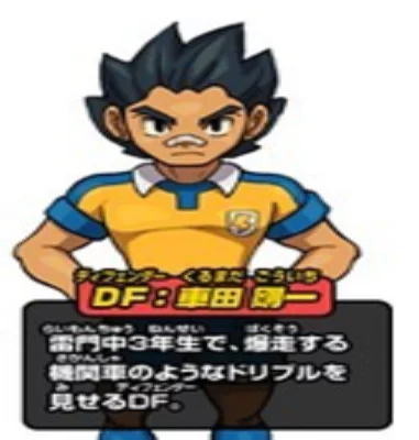 车田刚一是《闪电十一人GO》的人物,长相严厉并且鼻头上贴著ok绷,体格也相当强壮无比。拥有宛如失控电车般的加速能力。
