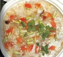 4、将上汤放锅内,下冬笋、草菇和鸡肝,以盐调味,加入九肚鱼肉,待煮沸后下红辣椒,倒入蛋白推匀,撒上夜香花及芫荽叶即成。