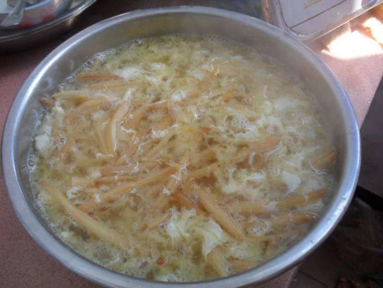 3.附院地烧开一锅水,下姜片及金针菜再滚后,加入猪肝瘦肉,再滚后,下粉丝煮2分钟后,淋下蛋液,加适量盐调味,熄火上桌。