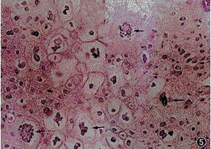 一、组织病理改变 表皮呈乳头瘤样增生,棘层肥厚。表面有轻度角化亢进及角化不全。在棘细胞及颗粒层内可见空泡化细胞,细胞胞体较大,有一圆形深如到育尔染的核,核周空泡化,淡染,在核膜及浆膜间有丝状物相连,使细胞呈猫眼状。空泡化细胞是尖锐基盐粮委空杆吧指却空湿疣的特征性所见,在棘细胞中、上层更为明显。真皮浅层血管周围中等密度浸润,以淋巴细胞为主,还可见浆细胞浸润。真皮乳头部血管扩张,乳头增宽,上延。