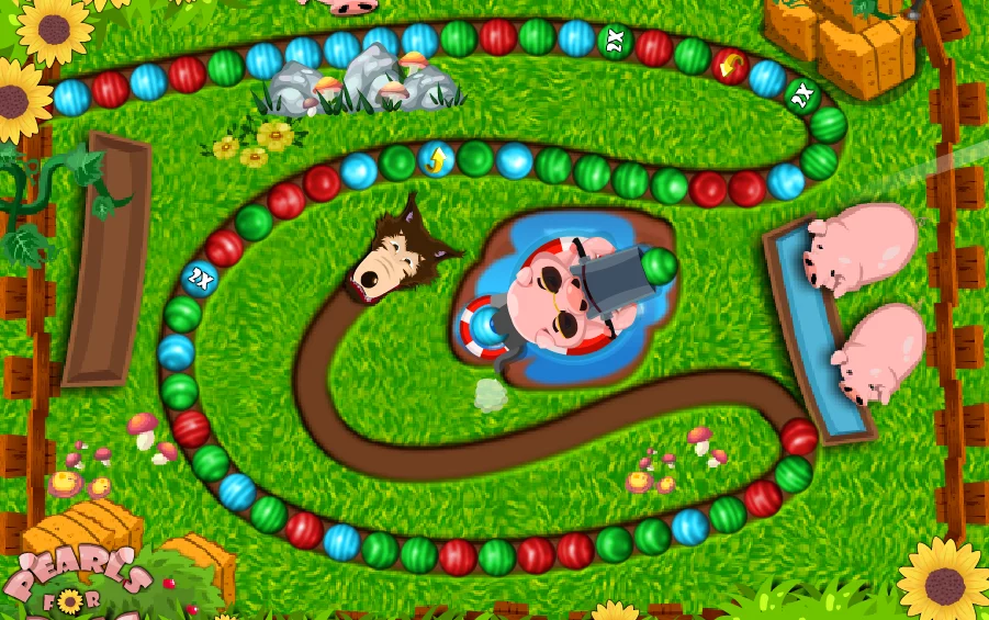 珍珠猪是个祖玛游戏,规则也是和祖玛的规则一样三个以上相同颜色的珍珠碰到一起来自才能消除,不要让大灰狼吃到珍珠。