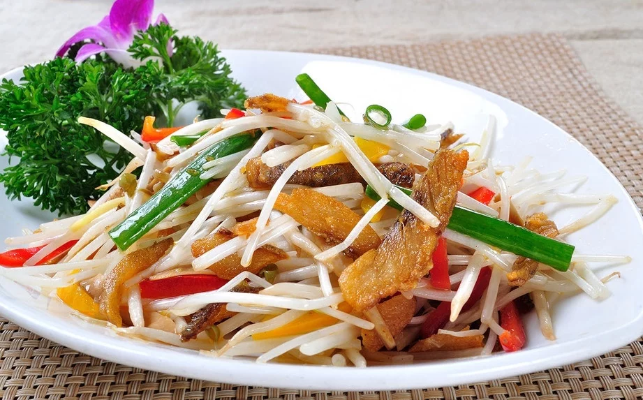 4、烧热油1汤匙,爆香姜片弃去,下银芽、芡汁料、银鱼快终,迅速兜匀上碟,洒入炸紫菜、甘笋丝便成。