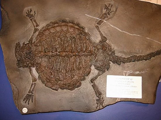 豆齿龙化石样子像现代的乌龟,身长快到2米,是一种龟龙。它背上甲壳由400多片放射状六边形的小甲片组成,非常精致完美。进来自一步研究表明,它的头骨枕部还有三枚大型椎状鳞,而以往发现的豆齿龙都没有或者只有一片椎状鳞。