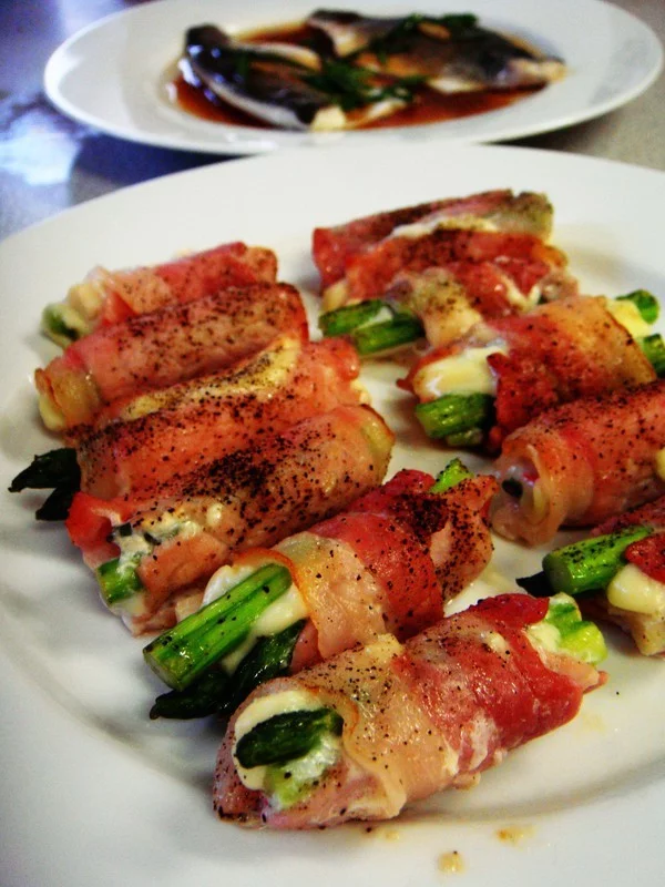 芦笋(取头部)、培根、白蘑菇。少许大蒜粉、黑胡椒粉、黄油。