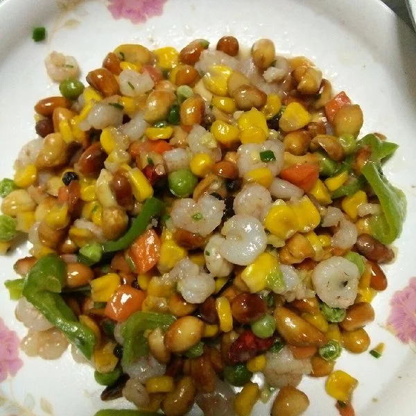 熟玉米粒,速冻豌豆,鲜虾,盐,料酒,益密支亲晶测本种鸡葱,姜,胡椒粉,水淀粉,油