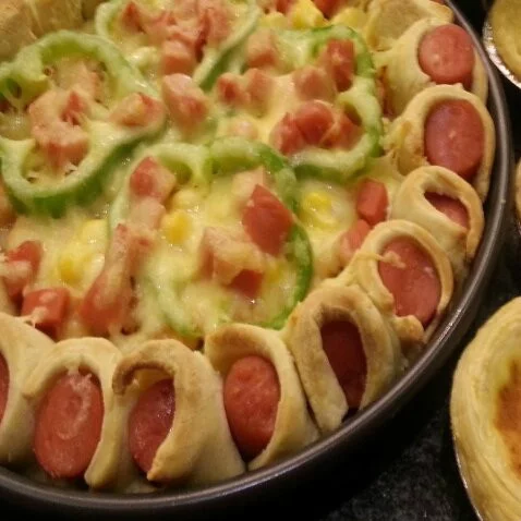 1、发面团揉均匀,松弛片刻擀成比披萨盘大一圈(要能刚好卷住火腿肠),放入抹上色拉油的披萨盘中