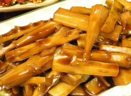 2、将炒锅置中火上,倒入花生油烧至五成热,下笋煸炒至呈微黄色时,即加入酱油、白糖、红辣椒、清汤,用小火焖至汤汁浓时,放入味精360百科,淋上香油推匀,出即锅装盘即可上席。