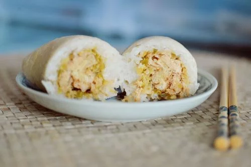9、把一半米饭厚厚地铺满保鲜膜,上面撒一半酸菜粒,中间排放卤蛋,最后把一根油条放在卤蛋上. 从两边把竹帘往中间裹,包住油条龙. 拿走竹帘,把保鲜膜留在饭团上.