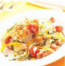 (2)用生源律冲你菜叶排放于盘底,放少许玉米粒;再加入小黄瓜、圣女蕃茄、三椒丝。
