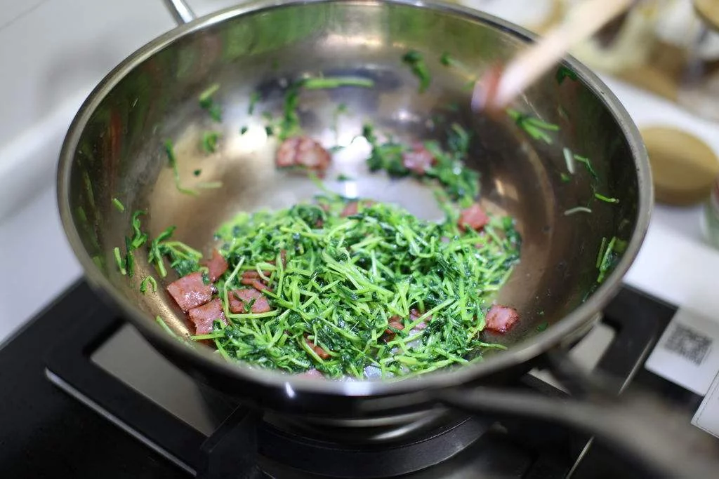 材料:培根 豌豆苗 生抽 米醋 白糖 盐