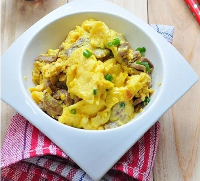 一道家常菜。主要食材是鸡蛋、牛肉,加上香椿苗,混合翻炒来烹制,用料酒和盐来调味。