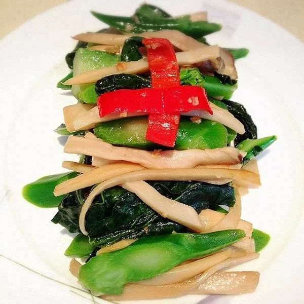 2、起镬多加一点油,炒黄芽白、芥兰和红精子亚面萝卜,再放入鲜菇、西兰花、珍珠笋及芽菜同炒,最后以鱼露调味即可食用。