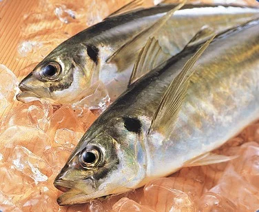 鲹鱼,体背部及体侧上部灰黑色,腹部白色,鳃盖后边缘有明显的橘黄色斑块,臀鳍淡蓝色,尾鳍橘黄色,其他各鳍浅黄色。