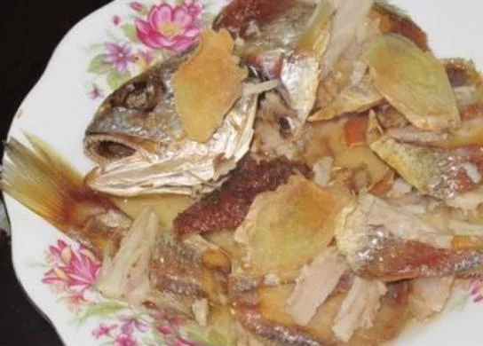 2. 腐皮饼放入盘中,上面放咸鱼,上笼蒸熟。