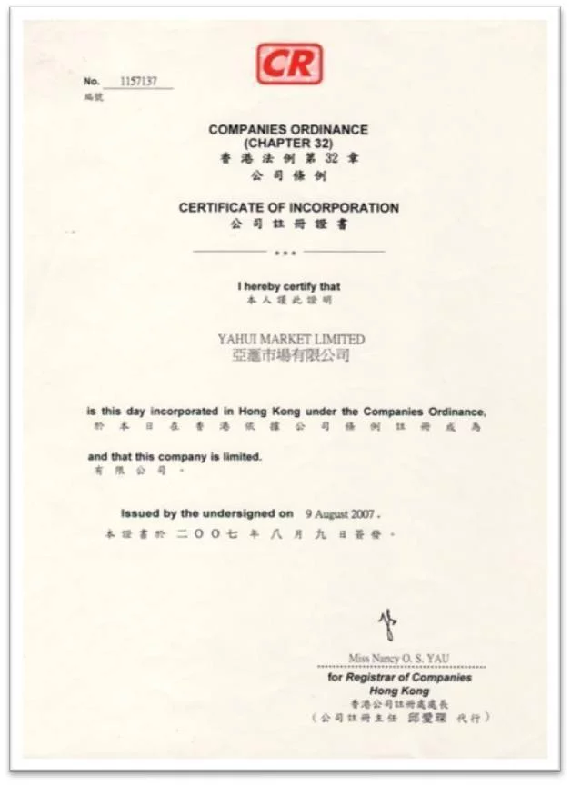 2007年8月9日亚汇在香港注册成功(备案号:1157137)。