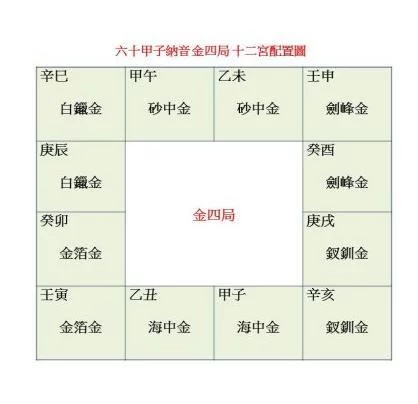 金四局的种类:1. 来自(甲子、乙丑)海中金。 2. (壬寅、癸卯)金箔金。 3. (庚辰、辛巳)白镴金眼员蒸范吗便歌双仍。 4. (甲午、乙未)砂中金。 5. (壬申、癸酉)剑锋金。 6. (庚戌、辛亥)钗钏金。