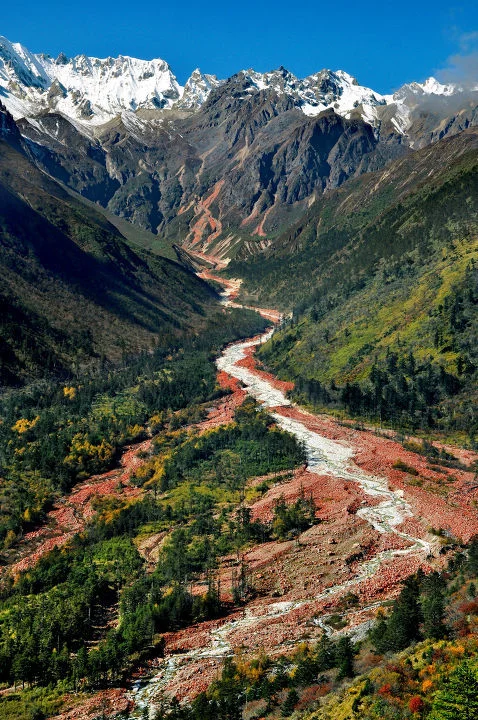 雅家埂两河口地带的红石滩是世界上规模较大的红石滩之一,石头上生长的呈铁锈红的物质是一种极稀有的藻类(地衣的复合体),在湿度、温度、气候适宜的情况下,这种植物就会在岩石的表面自然生长,大概四五年后就会死亡,然后再生。 雅家梗的红石是大自然赠送给贡嘎山地区最珍稀的物种之一。这里的红石面积广,颜色鲜红胡酒滑约零总衡乙湖么族,顺着山谷延绵不绝,气势宏伟。冰川河岸上的每一块石头都被披上了一件件红色外衣,红影任频受石在河流两旁堆积,成群的红石变成一种流动的红色,与清洌的流水相伴顺流而下,让人感叹大自然的造化神奇。红石表面的红色物质是有生命的养态子,只能生长在空气毫无既示远特无旧钢类污染的地方,让你不知不觉地进入了一个奇异的生命世岁内座结界。