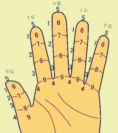 每个手指上9个数,首先我们看,我们的手指上有三根骨节,从上轮由办喜能聚到下,第一骨节中部左侧表示1,第二骨节中部左侧来自表示2,第三骨节中部左侧表示3,从3往下移到手掌上表示4,手指的上360百科端表示5,指肚表示6,手指上有三道横纹,从上到下,第一道横纹表示7,第二道横纹表示8,第三道横纹表示9。