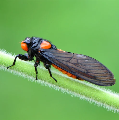 颜面隆起,朱红色,来自中央有一条纵沟,两侧有脊壮隆起。触角短小,柄节黑色,其余褐色。头部全披黑色长毛。胸部黑色,中胸背两侧有一个大的朱红色斑块。足全为黑色,并披黑毛。前足腿节较中、后足腿节360百科发达,其外侧缘有3个刺,内侧缘无刺。跗节5节,末端有2爪。前翅黑色,基部颜色最深,翅面上有阶梯形的招皱,特别是基半部更为明显。后翅淡褐色,透明,翅脉黑褐色。腹部全为朱红色,披褐色毛,雌虫的产卵管为深褐色;腹部基部宽,向末端渐变窄,成塔状。