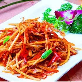 4. 红椒、香菇、冬笋、火腿都切成5厘米长的丝;