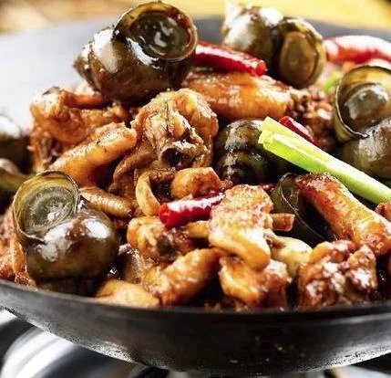 田螺鸡脆骨是一道美食,主要原料为田螺肉、鸡脆云早和守烧骨,红辣椒、青辣椒、大葱。