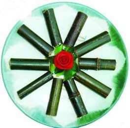 4、取出成熟的竹筒饭,沿其纵截面掰开360百科(可洒少许葱末,香菜于其上)置于盘中上席。