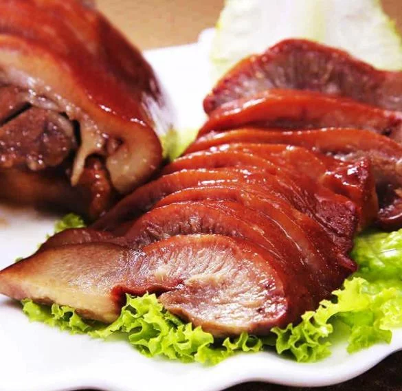 色泽红润,肉嫩皮软,甜香适口,肥而不腻。适合作冷荤酒菜,佐以薄饼和火烧最佳。