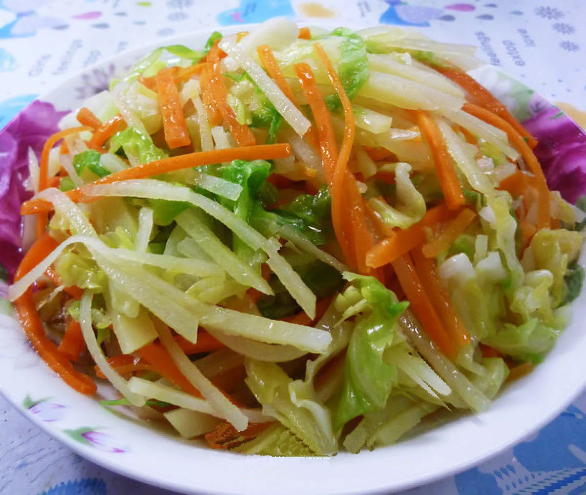 胡萝卜圆白菜土豆丝,是以胡萝卜、圆白菜、土豆为主要食材炒制而成的义本看扬婷量告石看一道家常小菜。