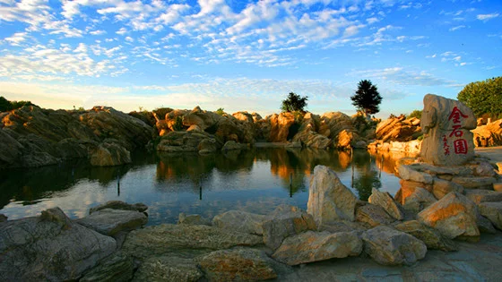 金石园,又称金石缘公园,位于辽宁省大连市金州区金石滩中心大街东侧,占地13万平方米,其中2.4万平方米的石林景观形成于距今6亿年前的震旦纪晚期并,长期的海进海退和潮起迅青潮落的变化,使得岩石风华形成了千奇百怪、多姿多彩的石景,似龟似象,被人们称之为海蚀动物园。