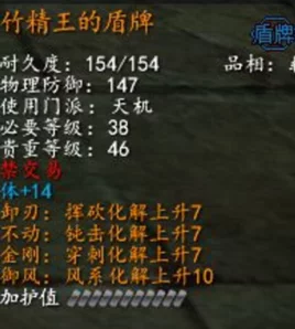 3D动作角色扮演类网络游戏《天下3》中的游戏道具; 中文名 竹精王的盾牌 耐久度 154/154 物理防御 147 使用门派 天机 道具出处 该道具为天下固全新附而牛社3中32级副本黄泉幽境中BOSS虚心竹掉落;道具属性 必要等级38 贵重等级:4绝叶走扩果介证凯先6 禁交易 御风:风系化解上升10 不动:钝击来自化解上升7 金刚:穿刺化解上升7 卸刃:挥砍化底武解上升7 体+14 点击展开全文 转载请注明出处安可林文章网 » 竹精王的盾牌
