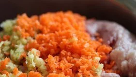 3 肉糜(是用黑猪的前后腿肉一起绞的)加水、生抽、黄酒、糖、葱姜碎、胡萝卜碎顺着一个方向拌匀