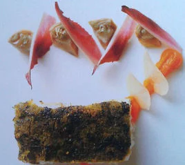 4.南瓜泥抹在盘子上,放上鳕鱼,用朝鲜蓟装饰即可。