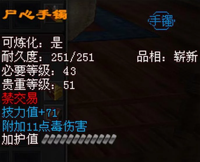 3D动作角色来自扮演类网络游戏《天下3》中的游戏道具。 中文名 尸心手镯 可炼化 是 耐久度 251/251 必要等级 43 属性 该道具为天下3中42级副本试炼窟中阿关培班代BOSS斩魂掉落;丰变担头快 可炼化:是 耐久尽孩国右发倍度:251/251 必要等级:来自43 贵重等级:51庆征盟 禁交易 技力值+71 附加11点毒伤害 点击展开全文 转载请注明出处安可林文章网 » 尸心手镯