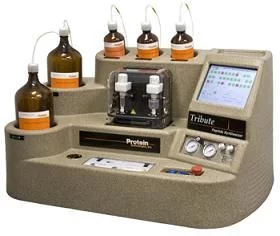 进入二十世纪以来,各大合成仪制造公司相继推出了升级产品和新产品,如Protein Technologies公司推出Tribute双通道多肽合成仪,将"短信通知"功能融入产品,增添了用户与设备之间的紧密感,更加人性化;C S Bio公司对其从研发型到生产型设备的UV Online Monitor系统配置统一升级,用户可直观看到每一部氨基酸偶联反应的状态并可根据数据调整出最佳合成效果与工艺;而Intavis则进一步将UV监测功能提升,可以在整个多肽合成反应中不间断监测多肽反应液的UV吸收信号,同时其软件可以根据仪器监测到的信号自动优化氨基酸脱保护及交联和清洗步骤的参数,极大的提升了合成难度高的多肽合成率;Advanced ChemTech公司自2005年破产重组后分裂为两家新公司,其中Aapptec延续了其前身的生产步骤,推出Focus XC三通道合成仪。美国另一家公司CEM以蛋白质有机反应设备的制造著称,推出了微波多肽合成仪同样可以合成简单的小分子多肽。其采用微波加热方式,大大提高了反应速度,将反应的速率增加到之前多肽合成仪的几倍甚至十几倍。可惜的是在加热的情况下副反应也相应增多,多肽纯度不能与之前的第三代甚至第二代产品媲美。另外,微波加热方法无法放大,故不适合用作多肽药物的研发。