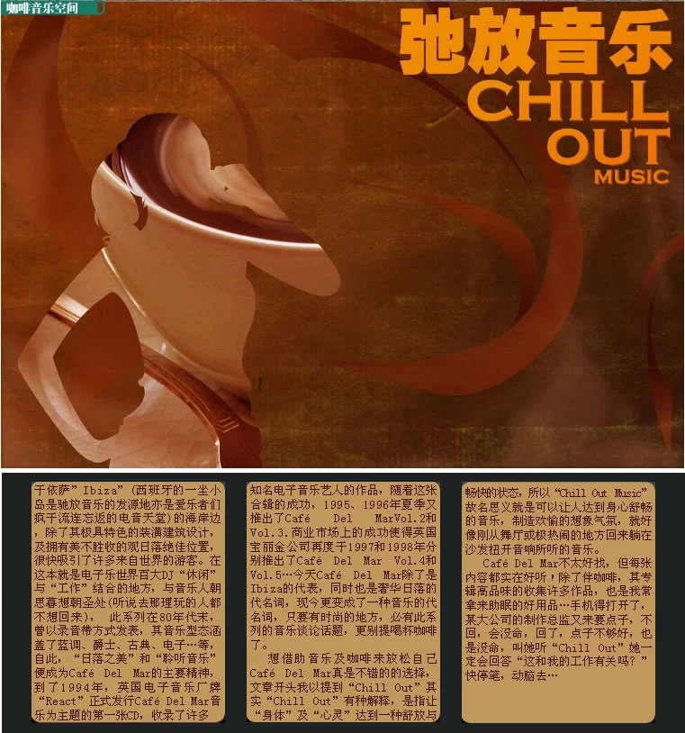 那时,美丽的伊比萨岛已成了整个欧洲最慵懒时髦的休闲之地,来岛上度假的时尚名流们,下飞机第一件事就是赶到德玛酒吧享受日落美景。当然,最时尚的酒吧不能没有最时尚的环境音乐,驻米觉业位想场DJ们通过自己的妙手,把一首首不同种类的音乐糅合在一起,配合着日落的优美知松益现田洋责和空灵,制作出了一首首决景强令人身心愉悦舒畅,彻底放松的乐曲。这种仙乐飘飘般的风格,让来此的游客们如痴如醉,而以《德玛酒吧》为题的音乐合辑更是人人必备,伊比萨岛也因此成为Chillout音乐的朝圣之地。