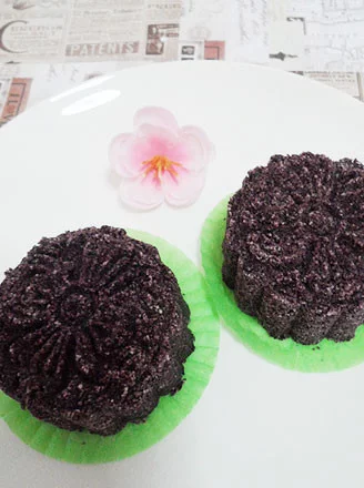 8、也可以把紫米粉装入模具一半的时候,放入一层豆沙馅或枣泥馅、或其它馅类,再放入紫米粉,来丰富口感。
