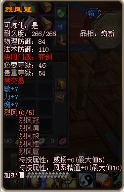 烈风冠是3D动作角色扮演类网络游戏《天下3》中的游戏道具。 中文名 烈风冠 类别 游戏道具 出处 《天下3》 耐久度 266/266 道具介绍 3D动作角色扮演类网络游戏《天下3》中的游戏道具;出处 该道具为天下3中45级副本古皇陵1层中BOSS魔音空唱掉落; 属性 可炼化:是 物理防御:84 法术防御:110 使用门派: 奕剑 必要等级:46 贵重等级:54 禁交易 敏+7 力+7 魂+7 点击展开全文 转载请注明出处安可林文章网 » 烈风冠
