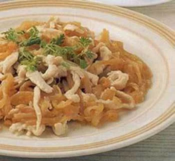 4. 把浸海蜇的水撇去浮沫,杂质倒入锅内,用慢火煮5分钟捞出海蜇头,用冷水过凉洗净,撕成小块,用净布搌干水分,加入鸡料子拌匀;