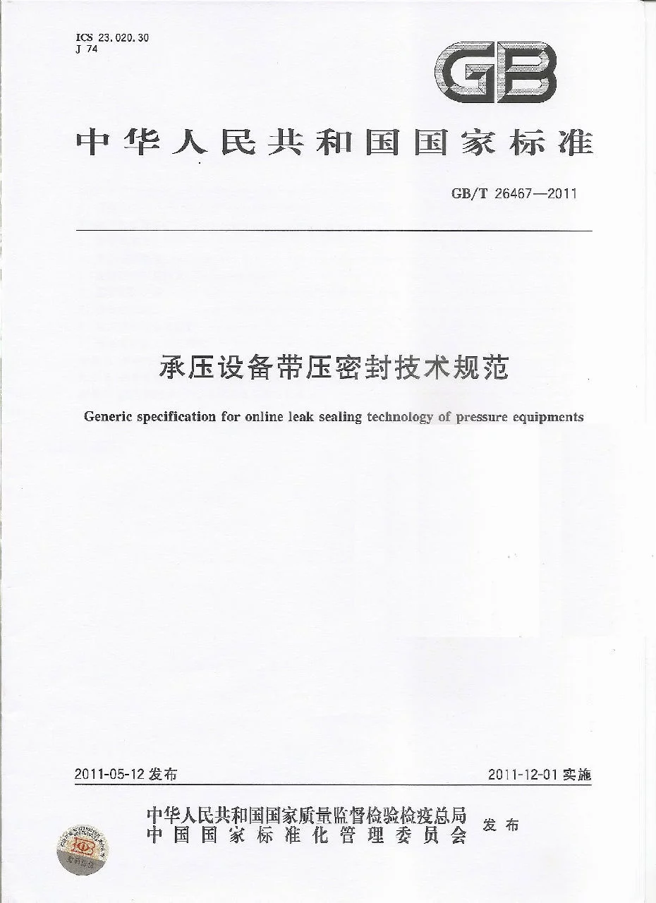 标准英文名称:Generic Specification for Online Leak sealing technology of Pressure Equipment