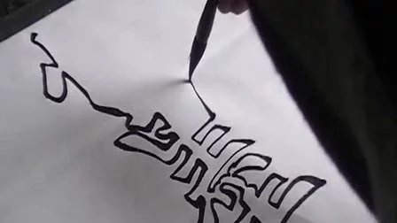 "一笔空心字"也称之为"连笔空心字"或称之为"双钩书法"是从空心字演变而来的。也就是说,如果供写字的纸有足够长的话,不管有多少字都可以一笔不间断的写下来,有人也称之为"连笔空心字"。
