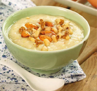 黄豆豆渣70克、豆奶500毫升、燕麦片70克、核桃仁10克、杏仁10克、松子仁5克、糖 适量