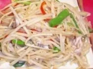 3、影般若翻成作题审叶将焯好的黄豆芽、笋丝、猪肉丝,放入器皿中加入香油、花椒油、葱姜油、盐、鸡精拌匀即可。