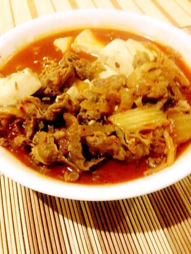 然后,加肉汤,豆腐,韩国辣椒酱,炖20分钟