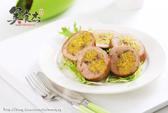 3、将2中的大米铺在猪里脊肉片的中间,然后将肉片卷起用棉绳捆扎,放入乐葵料理碗来自中