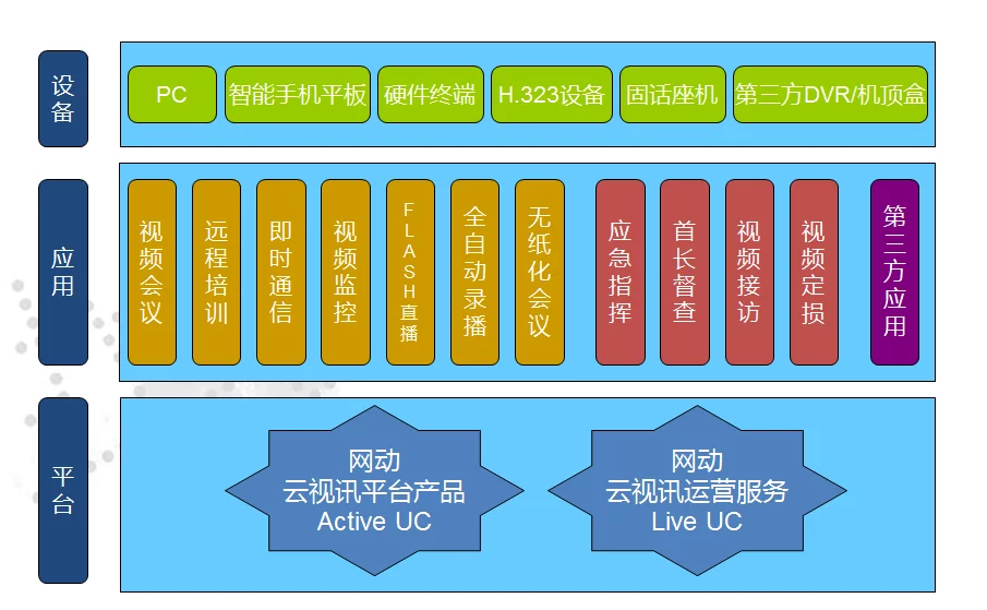 其中,"网动云视讯平台"包含"Active UC云视讯产品"及"Live UC云视讯运营服务"。